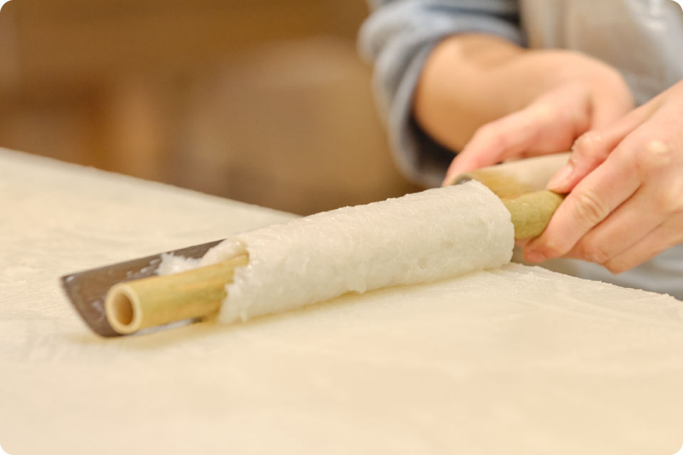 すり身を専用の包丁を使って竹の棒に巻き付けて作ります。作ったちくわは、焼きたてでお召し上がりいただけます。