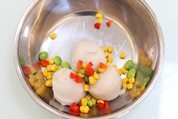 すり身にあなたの選んだ2~3種類の具材や味を加えてあげかまの身をつくります。