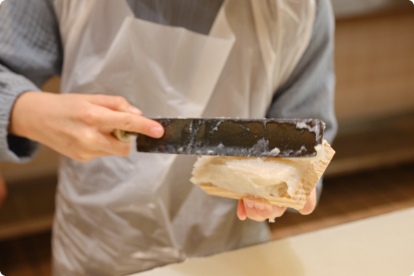 鈴廣かまぼこで毎日かまぼこをつくっている職人が、すりみを板にのせる実演を行います。