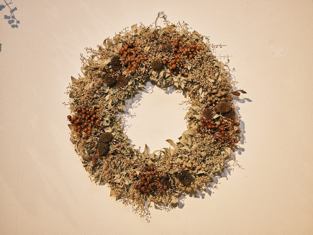 ふたつめは長く楽しめるように、さまざまな工夫や工程を経て丁寧につくられていることだ。自然のあるがままを表現するにも、すぐに形が崩れてしまったり、虫が発生したりしないよう、最善を尽くして下準備に時間をかけているそうだ。そうしてつくられたリースやブーケは、時を経て少しずつ色が変わり、より味わい深く、緑々としていた頃とはまた違った雰囲気を楽しむことができる。