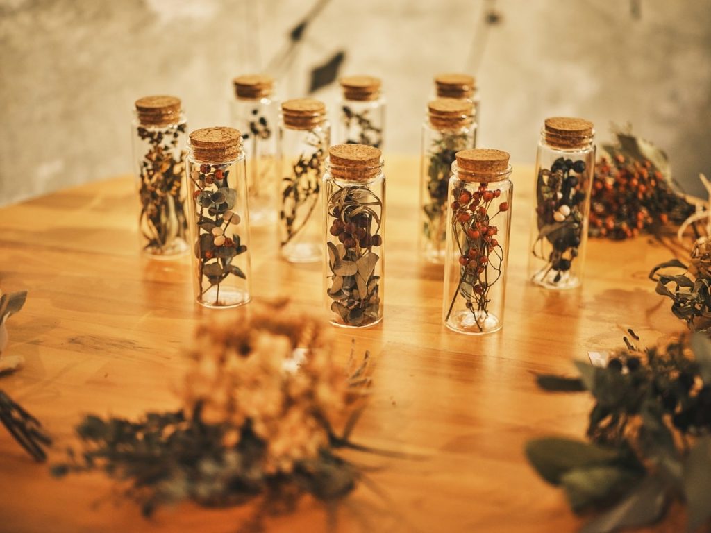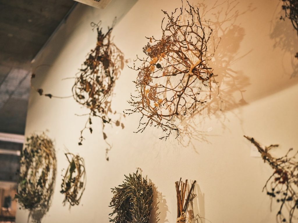 作品に使われる草花は、採集したのち、ひとつひとつ傷みや汚れを取り除き、乾燥させたあと、ドライフラワーとなり、リースやブーケへと生まれ変わっていく。