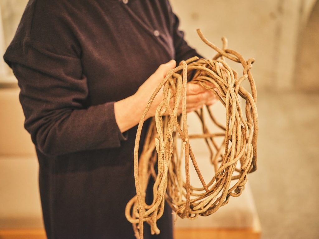 ひとつめは自然の中で育つ植物のあるがままの形が活かされていること。作品に使われる植物は、必要以上に手を加えず、人がつくることのできない自然の美しい色や形を大切にされている。自然が生み出した形や曲線が魅力的だ。