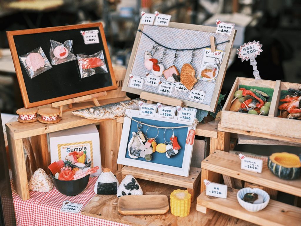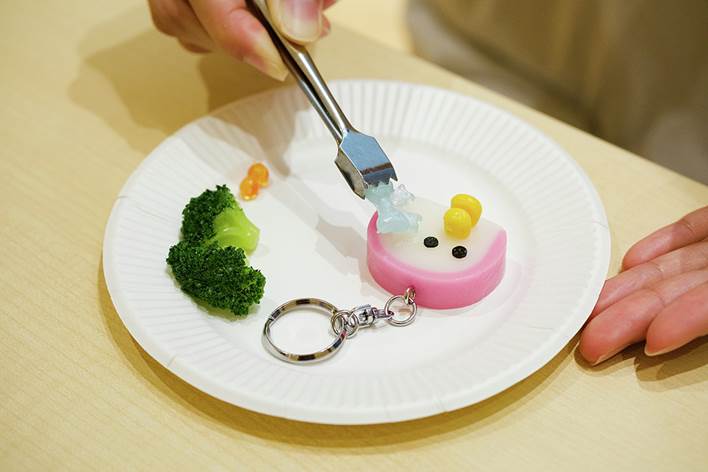 そんな食品サンプルの魅力を多くの人に伝えるべく、本多さんはさまざまなワークショップに取り組んでいる。「鈴廣かまぼこの里」では、「かまぼこキーホルダーづくり」を不定期で開催。かまぼこ・ちくわ・はんぺんなどの、鈴廣かまぼこの定番商品に、野菜や果物のパーツでデコレーションしオリジナルのキーホルダーをつくる人気のイベントだ。このほか、鈴廣の店内ディスプレイに使われている食品サンプルは、すべて小田原サンプルによるもの。買い物の際はぜひ注目してみよう。