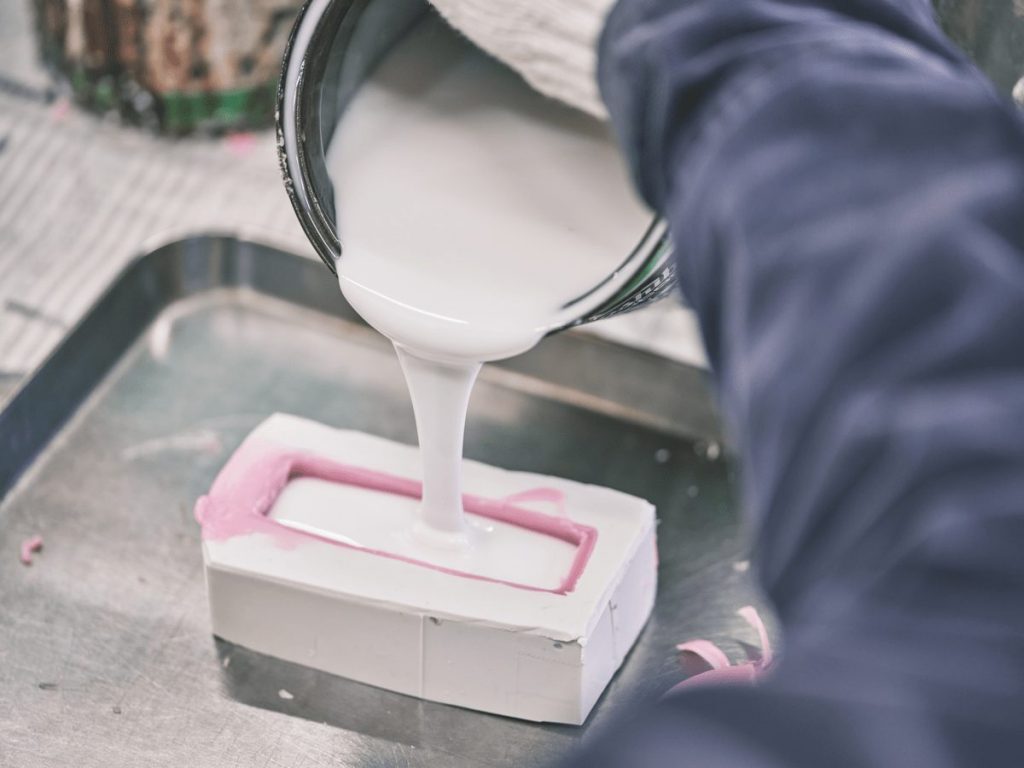 「食品サンプルは、まず型づくりからスタートします。お客様から提供された本物の商品を使って、シリコン樹脂で型を作成していきます」