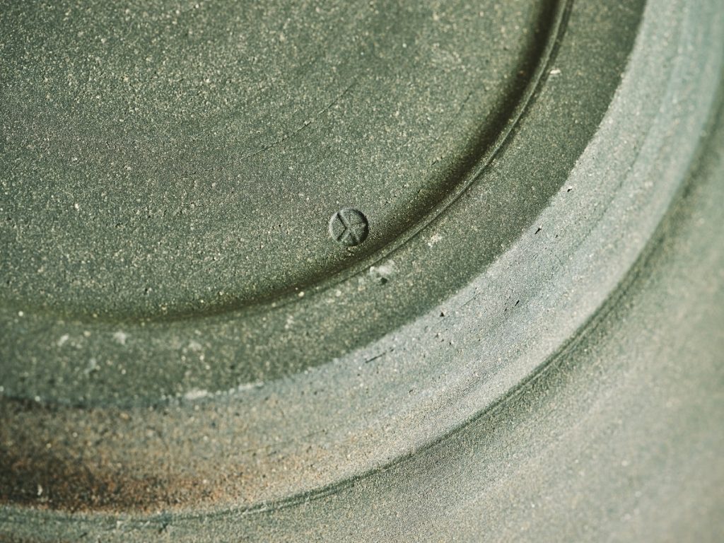 ちなみに、作品の裏側に釜印がありますが、これは趣味で焼き物を作っていた時から使っていた『ピースマーク』がモチーフになっているんです。陶芸を生業にする際、何か新しい釜印を考えようとも思いましたが、この作品がある場所が平穏で豊かであって欲しいという思いは当時から変わらないので、今でもこうして使っているんですよ」