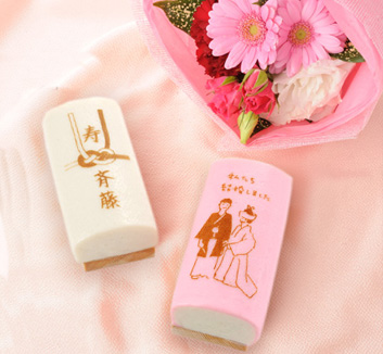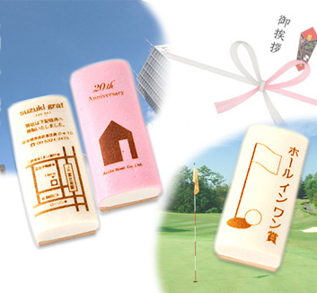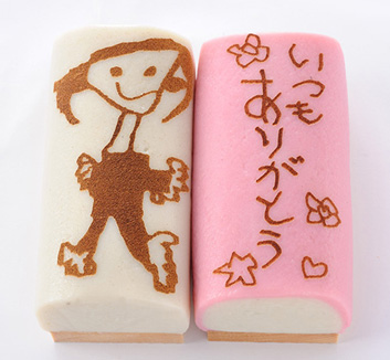 かまぼこに伝えたいメッセージやイラストを焼印いたします。お誕生日や結婚記念日、出産記念の贈り物として、また会社創立記念のノベルティとしてもご利用ください。
