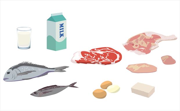 たんぱく質は筋肉や骨、血液の基となる身体づくりにとって無くてはならない重要な栄養素。毎食、主菜には、肉類や魚、卵、豆腐を使ったおかずを摂りましょう。