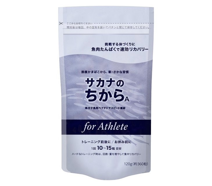 魚肉ペプチド「サカナのちから A for アスリート」は、効率的にスタミナ補給、体づくりができます。