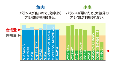 アミノ酸はバランス良く含まれていることが大切で、図の小麦たんぱくの様に一つでも値の低いものがあると、その値までしか次のタンパク質合成が行われず、他は体外に排出されてしまいます。図の魚肉たんぱくの様に全てのアミノ酸がバランス良く含まれていると、効率良くタンパク質の合成が行われるのです。