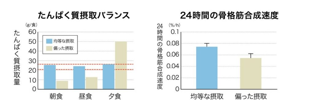 一日のタンパク質の必要量を把握するのと同時に気を付けたいことがあります。それは、毎食均等にタンパク質を摂ることが大切ということです。