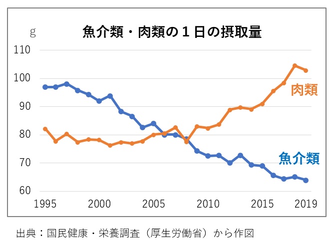 厚生労働省が公開している「国民健康・栄養調査」によると、2010年頃を境に日本人の魚介類の摂取量を肉類の摂取量が追い抜いた事が分かりました。