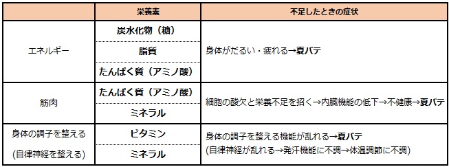 上記の五大栄養素の表を見ると、どの栄養素も重要ですが、たんぱく質は、人間の筋肉、血、骨、内臓を作る材料となる栄養素です。体力や免疫にも関わりが強く、夏の暑さに負けない身体を構成する上で、重要な働きをしているのがたんぱく質である事がわかります。