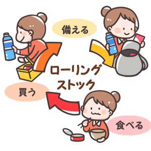 ローリングストックとは、循環させながら(ローリング)、備蓄(ストック)するという意味です。いつも使う食材を多めに購入し、賞味期限が近づいたら消費して、また新しいものを追加する、といった備蓄方法です。備蓄したくても保管場所がない、保存期間が長い食品に安心していつの間にか賞味期限が切れそうになる、といった備蓄食料への不安を解消できます。