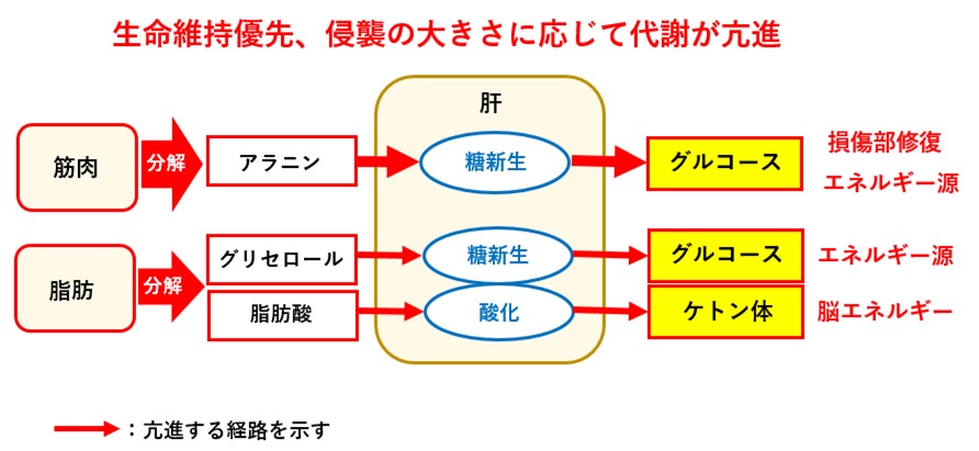 脂肪組織が分解されてできた、脂肪酸とケトン体がエネルギー源として使用されますが、これに災害などの侵襲の要素が加わると・・・・・