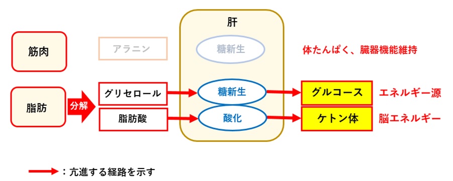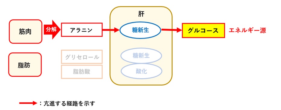そうすると生体は筋肉を中心とした体たんぱくを分解して生じたアミノ酸を次のエネルギー源にしようとします。筋肉の分解によって生まれたアミノ酸(アラニン)が肝臓に運ばれ、糖新生によりグルコースに変換されエネルギー源として使われます。たんぱく質の補給が行われないと、急速なたんぱく質の崩壊が発生してしまいます。