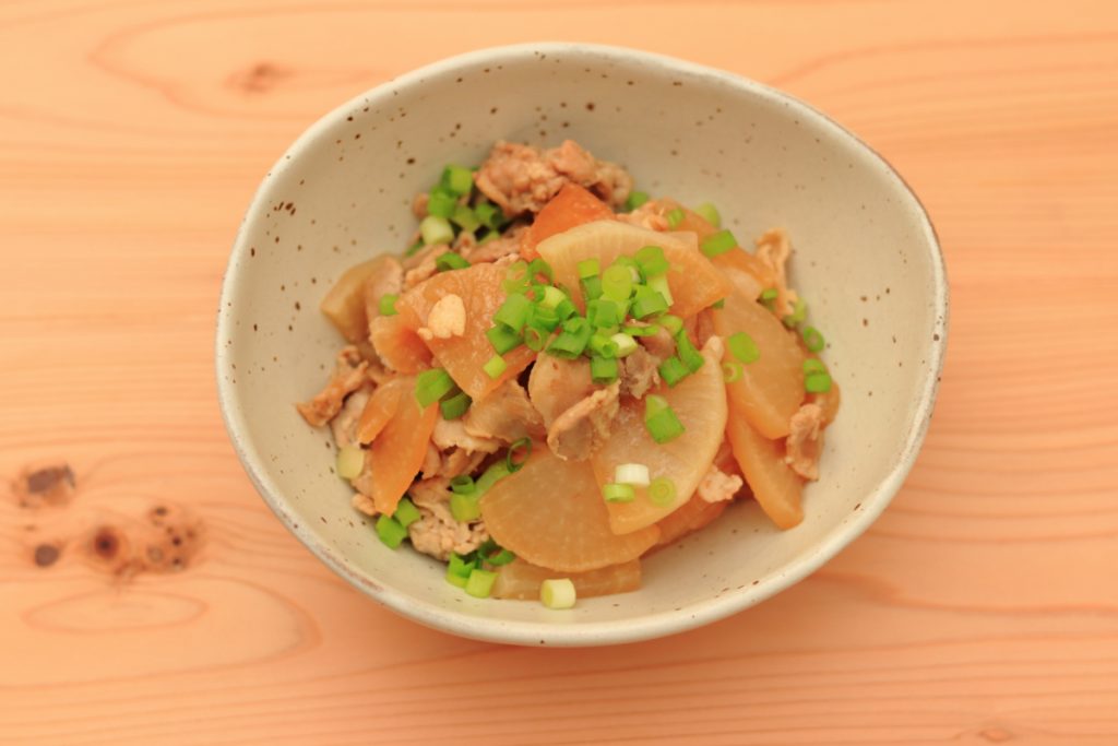 豚肉をひと口大に切ります。大根、にんじんは薄い輪切りにカット。フライパンにサラダ油を熱し、大根を入れて炒めて、両面に焼き色がついたら、皿に取り出します。