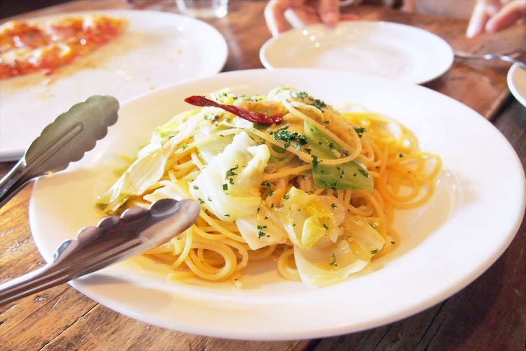 1.大きめの鍋にたっぷり湯を沸かしておく。にんにくをみじん切りにする。春キャベツと豚ロース肉を食べやすい大きさに切る。