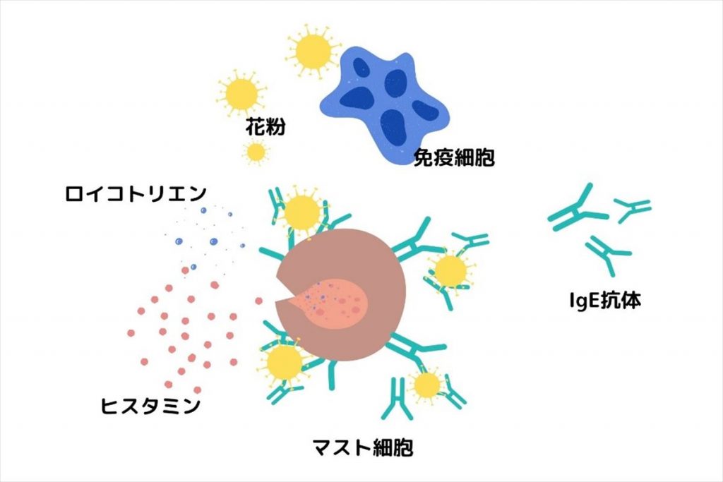 IgE抗体と合体したマスト細胞は、花粉に触れると化学物質を出すのです。