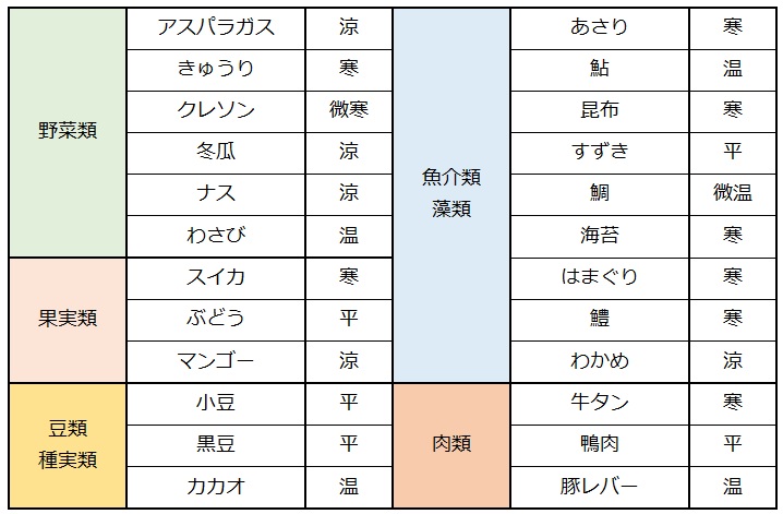 温めるものが「温」、少し冷やすものが「涼」、しっかりと冷やすものが「寒」、温めも冷やしもしないものを「平」と表します。