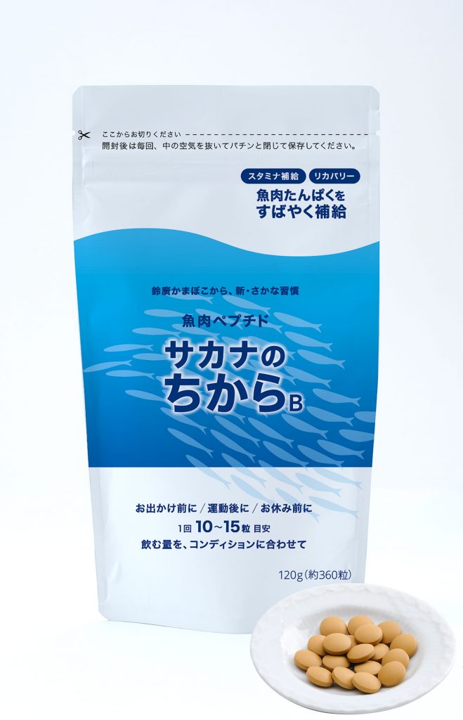 鈴廣かまぼこ開発の「サカナのちからB」は、天然の白身魚でつくられたサプリメントです。