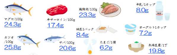 ご参考までに、主な食品に含まれるタンパク質量を紹介します。