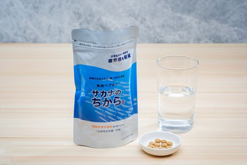 魚肉ペプチドとしておススメしたいのが、鈴廣かまぼこ開発「サカナのちからB」です。「サカナのちからB」は、魚の白身を酵素分解してつくった天然素材のサプリメントです。摂取後30~40分程で体に吸収されるので、「ゴールデンタイム」に合わせて身体に必要不可欠なアミノ酸を素早く効率的に補給することができます。2022年には疲労感の軽減効果で、機能性表示食品として販売を開始いたしました。