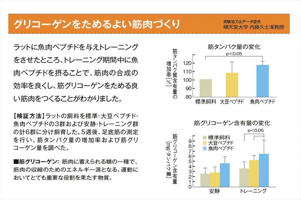 体内に吸収されやすいということは、トレーニング時の栄養補給に最も適しているという事になります。魚肉ペプチドは、マラソンや自転車競技などの持久力が求められるアスリートにオススメです。