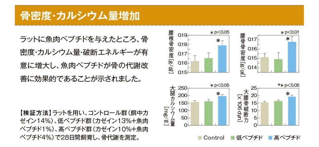 また、大腿骨中のカルシウム量でも、魚肉ペプチドを混ぜた飼料を与えたラットのほうが高くなりました。