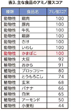 まず、下のような「アミノ酸スコア表」で、良質なタンパク質を含む食品をチェックしましょう。