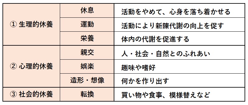 この休養モデルでは、休養を①生理的休養、②心理的休養、③社会的休養の3つに分類し、それぞれに該当する休養法を整理しています。