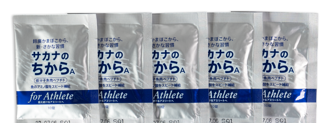 鈴廣かまぼこ開発の「サカナのちから A forアスリート」は、魚肉ペプチドを主原料にした天然素材のサプリメントです。