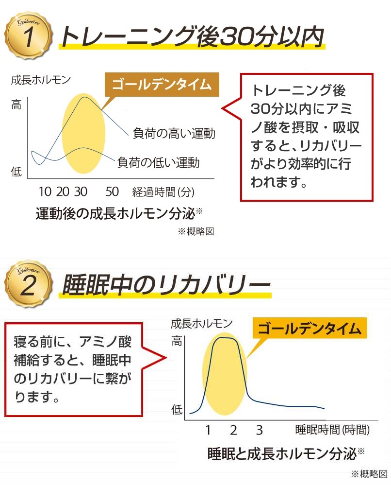 運動の30分後と就寝の1~3時間後は「筋肉づくりのゴールデンタイム」といわれ、この時間になると成長ホルモンの分泌が盛んになり、筋肉の修復が行われます。 その時に筋肉の原料となるアミノ酸が豊富にあると、筋肉の修復がうまくいき、筋肉づくり・疲労回復につながるのです。