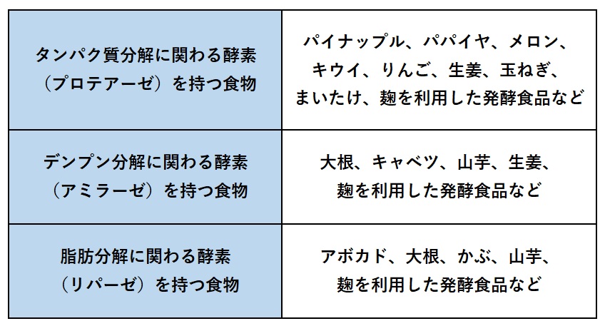 食物酵素のうち、消化酵素を助けてくれる酵素を持つ食物の一覧を以下にご紹介します。