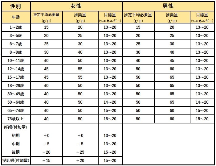 日本人の食事摂取基準(2020年版)によると、1日のたんぱく質の、必要摂取量は次の表のとおりです。