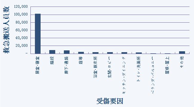 調査の結果をみると、意外なことにもっとも身近な居場所「居室・寝室」で圧倒的に発生していることが分かります。その差は居室・寝室での発生10万人に対し、2位以下は数千人と10倍以上のひらきがあります。