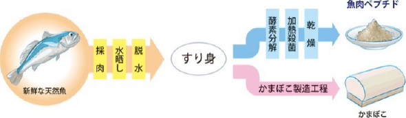 「サカナのちから」の主原料は、かまぼこと同じ魚のすり身を酵素分解した魚肉ペプチド。