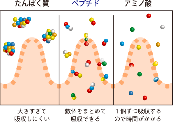 ペプチドとは、たんぱく質が消化酵素で分解されてアミノ酸が数個つながっている状態のこと。その為、アミノ酸をまとめて効率良く体にとりこむことができ、消化吸収力の落ちた災害時にも最適です。