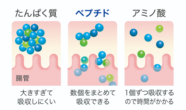 ペプチドとは、タンパク質の状態のことで、タンパク質が分解されて、タンパク質を作っているアミノ酸が数個まとまった状態のことを言います。アミノ酸を数個まとめて体内に取り込めるので、吸収スピード・吸収効率に優れています。