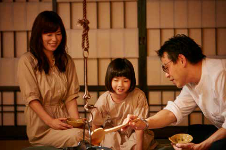 人が人である所以囲炉裏で米を炊き、鮎を焼き、鍋を囲む。いのちがあるかのような炎の動き、ゆらりゆらりと昇る湯気、ただひたすらに見つめていると、徐々にお腹を誘う香りが漂ってきます。ご家族やご友人とふぅふぅアツアツを召し上がってください。
