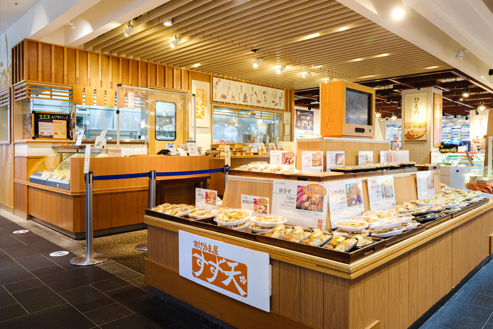 野菜や魚介をすり身の衣で包んで揚げた天ぷらをおつくりしております。かまぼこ屋の天ぷらは、小麦粉の代わりにお魚のすり身を贅沢に使います。